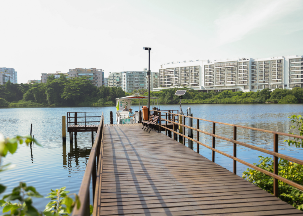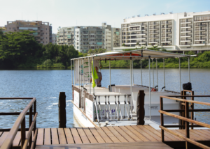 Esqueça o trânsito e aproveite a brisa. Nossa balsa exclusiva atravessa a Lagoa de Marapendi, levando você do condomínio diretamente às areias da Praia da Barra em um trajeto ecológico e relaxante.